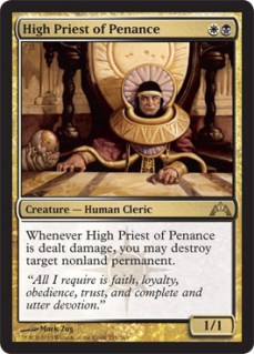 The Crypt Ghast is an Extort enabler, and protecting it will be a serious priority if it gets cast – similarly removing it from your opponent if he’s fielding Orzhov against you is going to be one of your top goals. High Priest of Penance? Good god, yes. You need to slow your opponent while you nibble them to death with Extort, so dissuading them from attacking you is great. Nobody wants to trade a valuable, targetable nonland permanent for a WB 1/1. Pop some Illusionist Bracers on him and they’ll be doubly reluctant to let you kill him off as a chumpblocker. And if you can make him more resilient? Well, then he’s just exponentially lovely!
